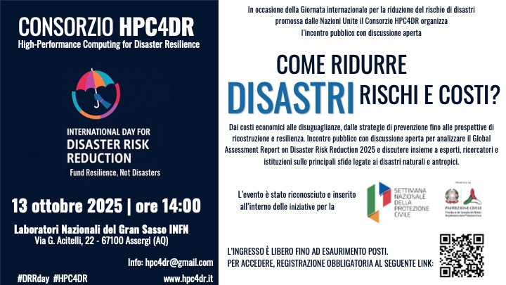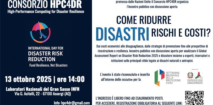 Il prossimo 13 ottobre 2025, in occasione della Giornata internazionale per la riduzione del rischio di disastri, il Consorzio High-Performance Computing for Disaster Resilience (HPC4DR) organizza l’incontro pubblico “Disastri: come ridurre il rischio e i costi?”, presso i Laboratori Nazionali del Gran Sasso dell’Istituto Nazionale di Fisica Nucleare (INFN) a L’Aquila, dalle ore 14:00.