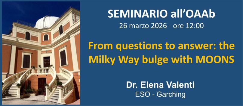 Giovedì 26 marzo alle ore 12:00 Elena Valenti (European Southern Observatory, Garching – Germania) terrà un seminario dal titolo “From Questions to Answer: The Milky Way bulge with MOONS”. ABSTRACT: The formation of bulges remains one of the key open questions in galaxy evolution. Several mechanisms have been proposed – such as the dynamical instability […]